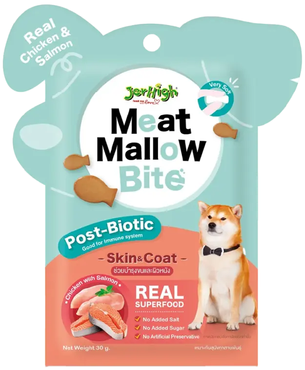 It is a dog snack that is more than delicious. Meat mallow bite is “made from real chicken meat” and has the benefits of superfood. Focus on soft texture, easy to eat, bite-sized pieces, including Postbiotics which help the digestive system better than other biotics, balancing the body and nourish immune system.
