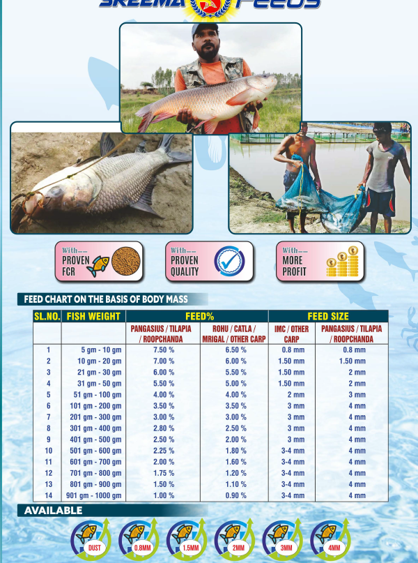 • Feed Features: It is an extruded floating feed for various fish species (IMC, Pangasius, Clarias, Anabus & Pacu), offering scientifically formulated, complete, and balanced nutrition. It’s manufactured with proven technology, ensuring good palatability, digestibility, and higher fish growth with better Feed Conversion Ratio (FCR), while minimizing water pollution.