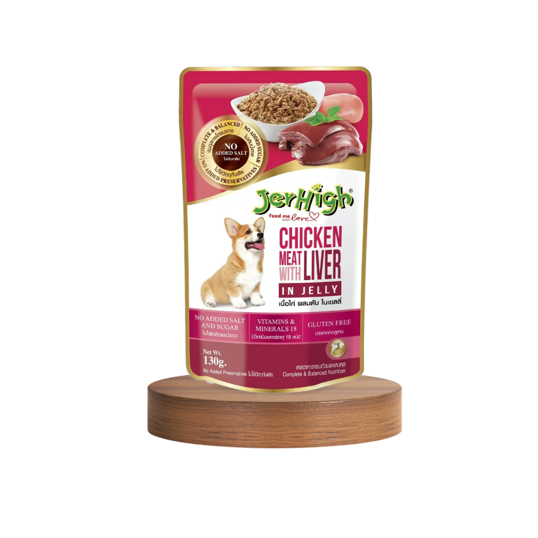 JerHigh Chicken and Liver Jelly is a natural and healthy meal made with real chicken and liver, offering a delicious and nutritious treat for your furry friend. Its gluten-free formula ensures easy digestion, making it ideal for dogs with sensitive stomachs.