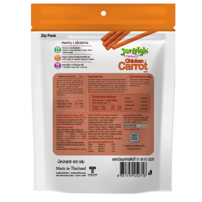 JerHigh Carrot Stick is made from real chicken and has been meticulously prepared by our highly experienced expert team.