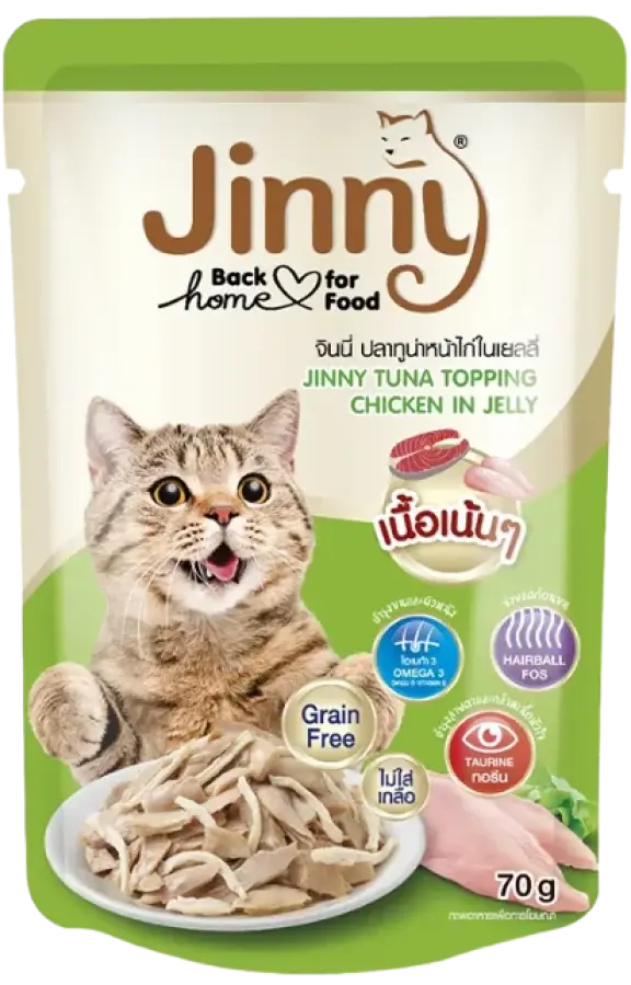 Jinny Chicken in Jelly is a premium cat food crafted with a grain-free formula to promote healthy digestion and reduce the risk of food allergies. It supports hairball control, helping prevent hairballs while maintaining a healthy digestive system.