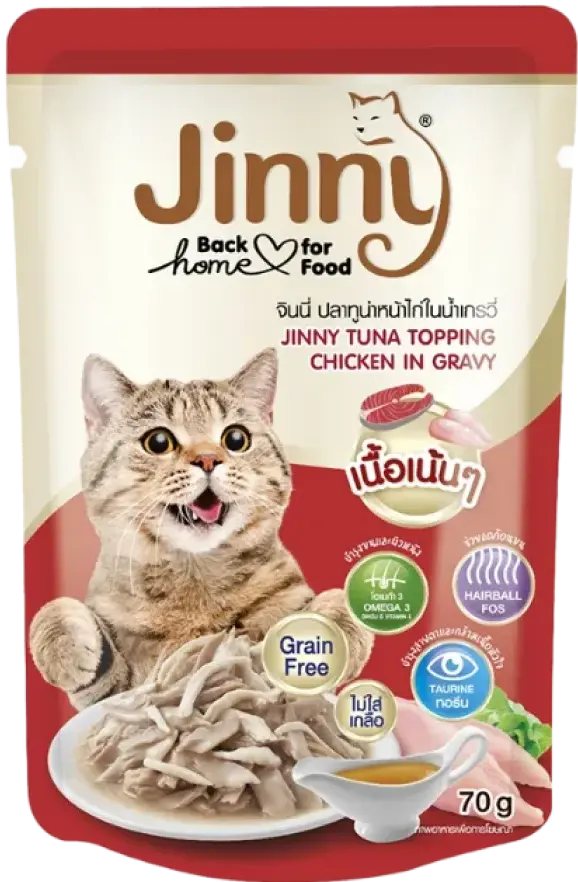 Jinny Tuna Topping Chicken in Gravy is a delicious and nutritious cat food made from real Tuna and Salmon, offering a rich and flavorful meal for your feline friend. Its smooth texture makes it easy to eat and digest, ideal for picky eaters.