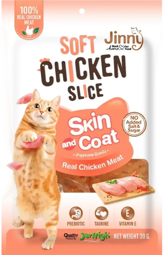 Jinny Soft Chicken Slice is a wholesome and nutritious treat crafted with real chicken meat to promote your cat’s overall health and well-being. Enriched with essential nutrients like Taurine and Vitamin E, it helps maintain healthy skin and a lustrous coat. The inclusion of prebiotics supports digestive health, ensuring your furry friend feels their best. Free from added salt and sugar, this guilt-free treat offers a safe and nourishing option without harmful additives. Its soft and chewy texture makes it easy to chew and digest, making it ideal for cats of all ages. Packaged in a convenient resealable pouch, it ensures lasting freshness and easy storage for everyday use.