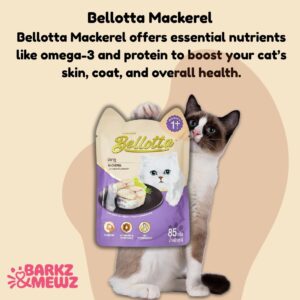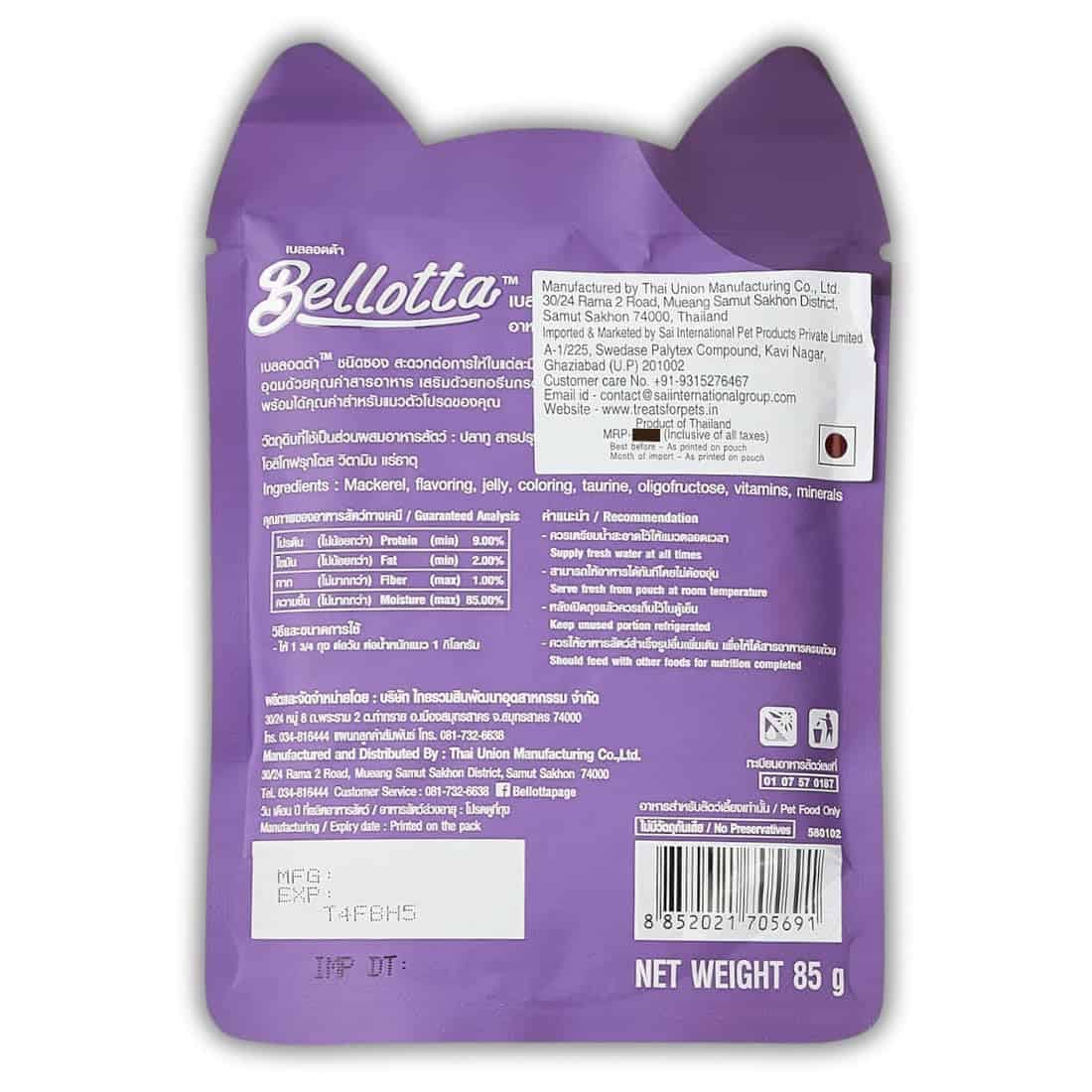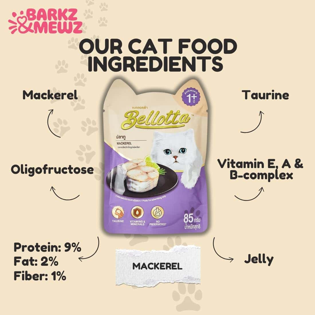 Bellotta Mackerel Wet Cat Food suits all breeds and sizes aged over 1 year. Ingrediants are Tuna, Vitamins & Minerals, Flavouring, Jelly, Oligofructose, Taurine, Coloring.