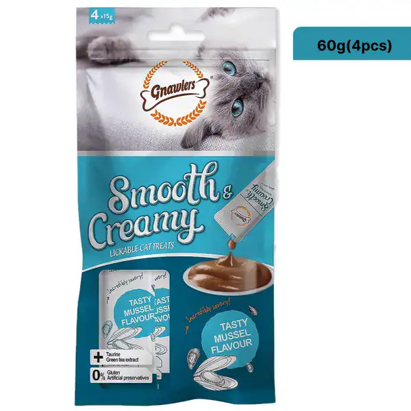 Gnawlers Smooth Creamy Treat with Mussels is a tasty wet treat for your adult cat of any breed.
