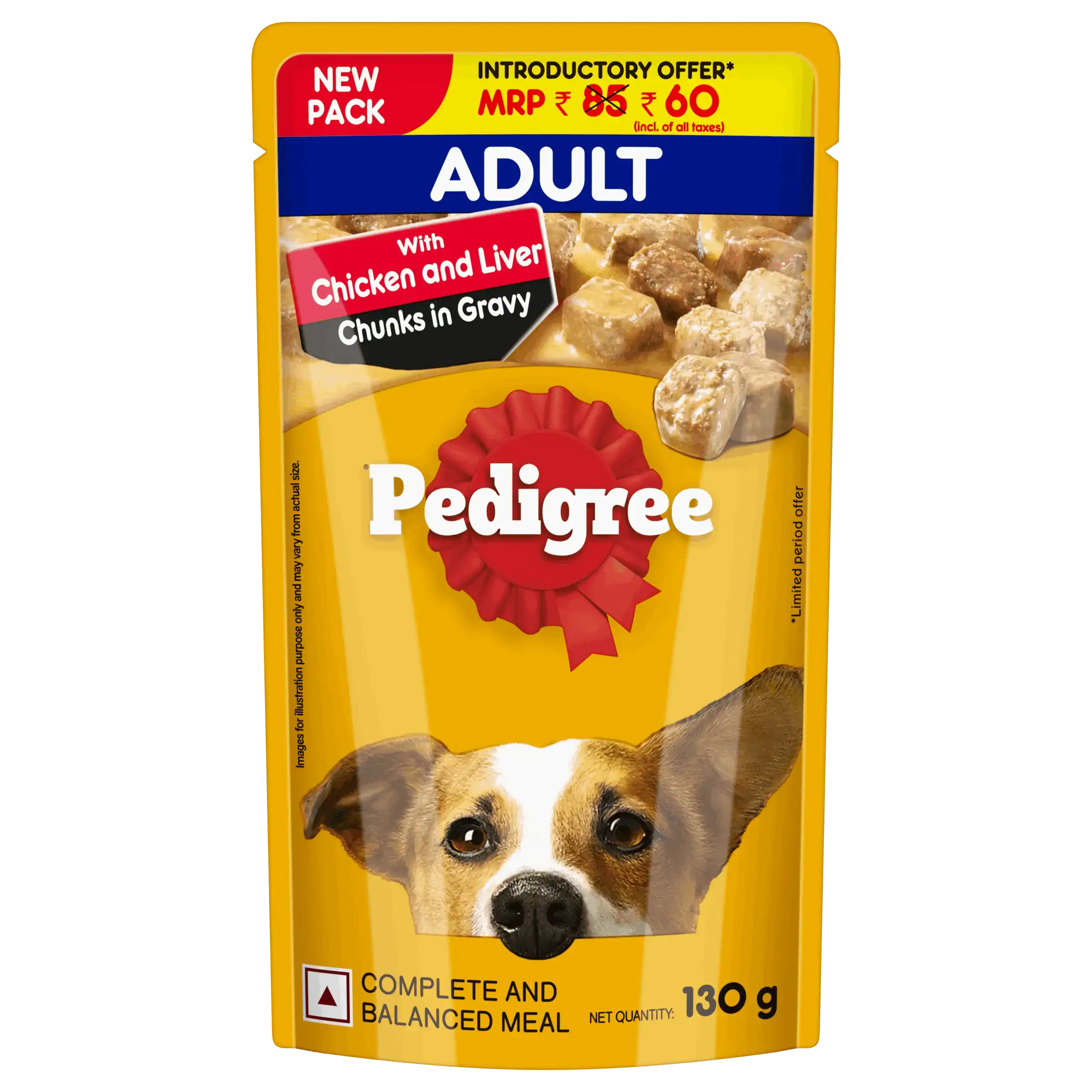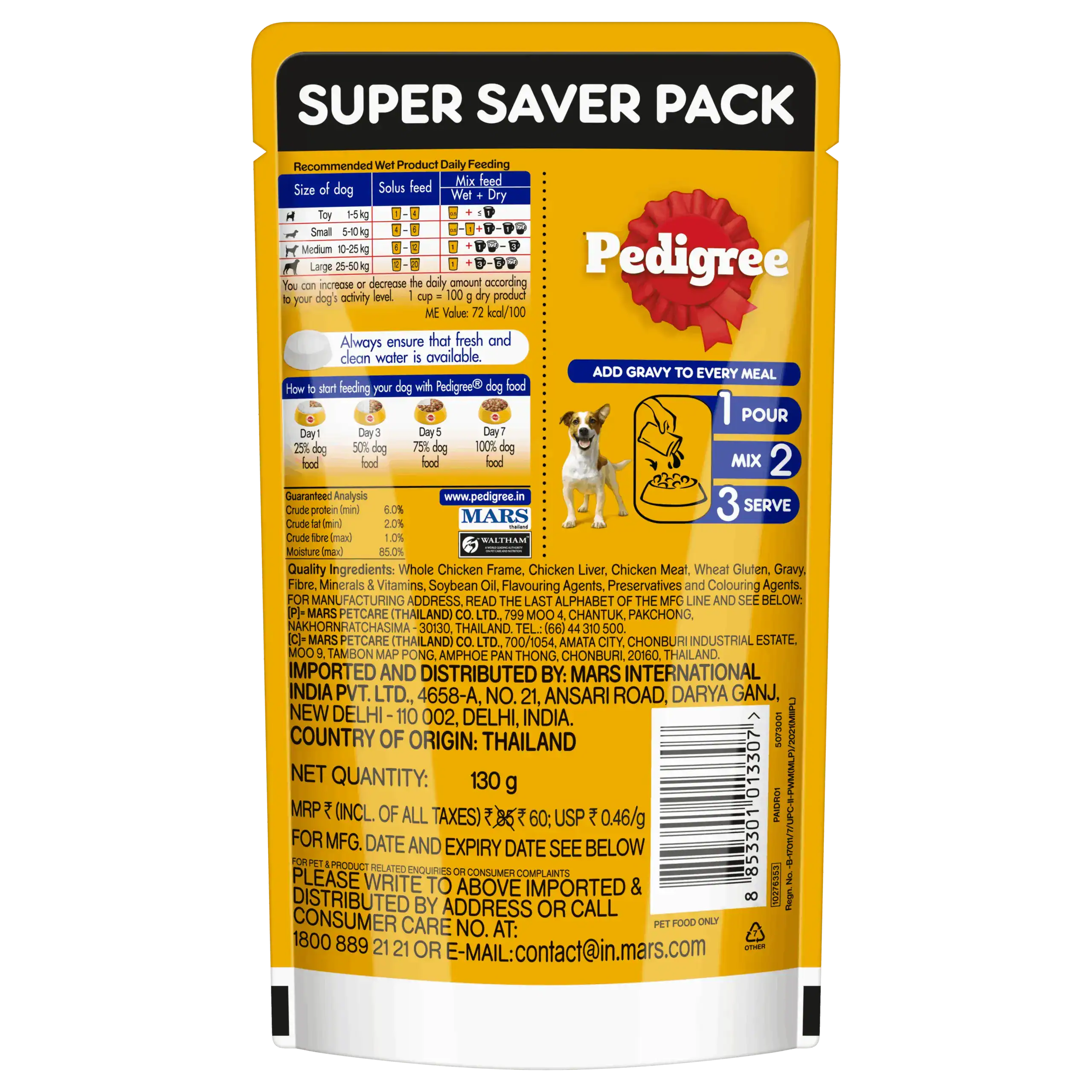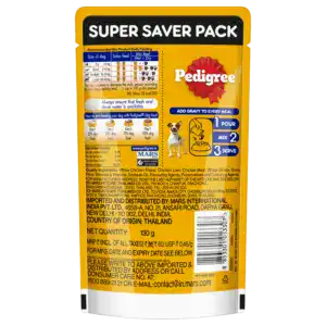 Can be mixed with pedigree dry dog food or home cooked foodWhole Chicken Frame, Chicken Liver, Chicken Meat, Wheat Gluten, Gravy, Fibre, Mineral and Vitamin, Soyabean Oil, Flavouring Agents, Preservatives and Colouring Agents