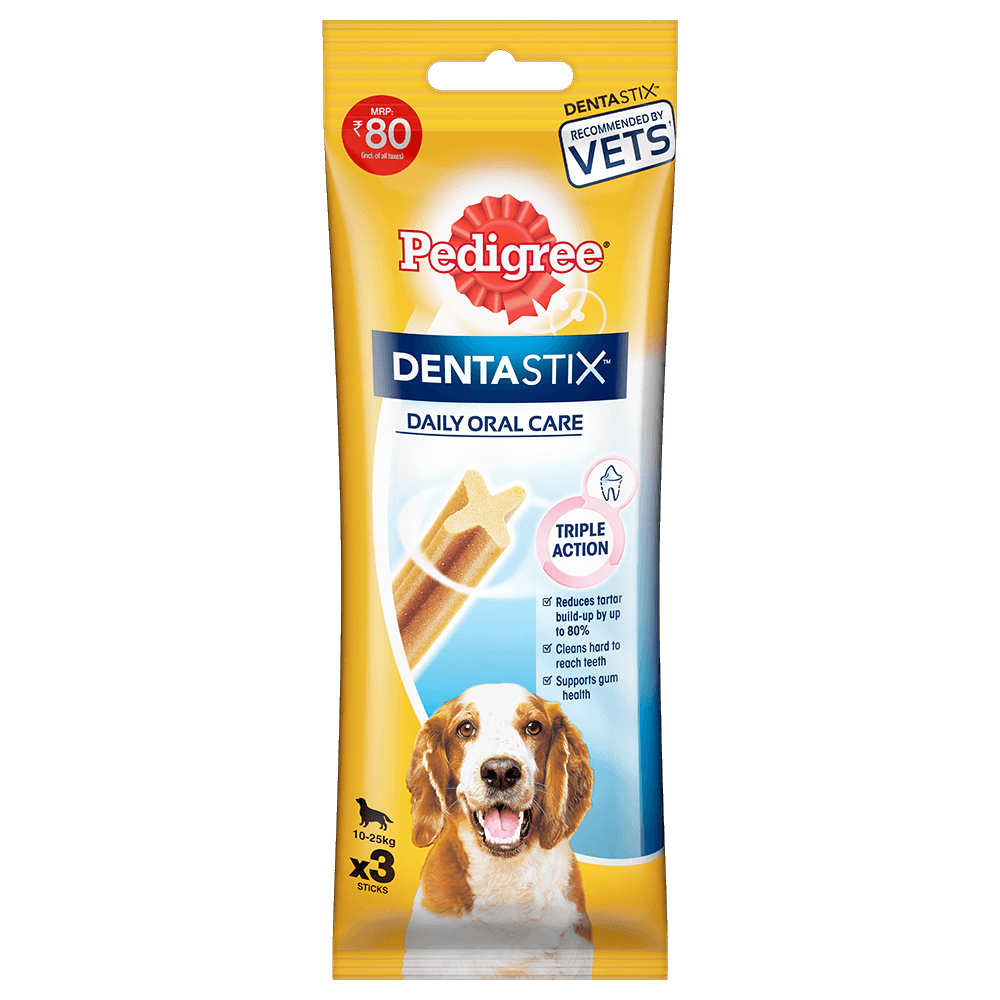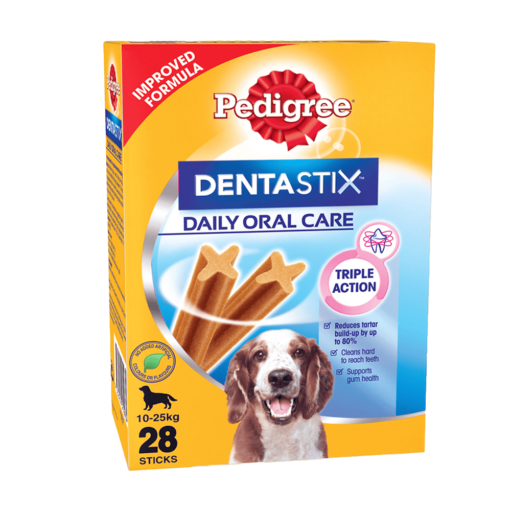 Did you know that 4 out of 5 dogs over the age of three suffer from gum disease? PEDIGREE® DENTASTIX™ is an effective daily oral care dog chew treat that is scientifically proven to help reduce tartar build-up in your dog’s teeth by up to 80%. PEDIGREE® DENTASTIX™ is available for adult dogs of all breeds and sizes : Small, Medium & Large