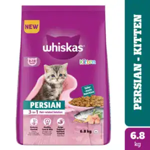 WHISKAS® Persian Kitten Dry Cat Food provides 100% complete & balanced nutrition, specifically designed to meet the unique needs of kitten (2-12 months) cats. A Persian cat’s distinctive trait is its long and luxurious coat, due to which it is prone to several hair and skin-related concerns. This WHISKAS® Persian cat food provides 3-in-1 hair-related solutions for Persian cats. The essential nutrients help reduce hair fall. It’s formulated with omega-6 fatty acids, zinc, biotin, and other B vitamins for a healthy skin and coat. It includes beet pulp fibre which helps support hairball control through the digestive system. With tailor-made nutrition, this cat food includes Vitamin E, an antioxidant, for a healthy immune system. It contains colostrum, a nutrient-rich goodness found in mother’s milk. WHISKAS® is developed by experts at the Waltham Science Institute for Pet Nutrition, a world-leading authority on pet care. Please feed according to the feeding guidelines mentioned at the back of the pack. Support your kitten’s growth and appeal to their taste buds with WHISKAS®, the most trusted cat food. All the cats and kittens prefer WHISKAS®…even the fussy ones!
