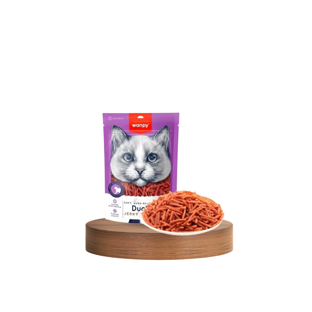 Wanpy Soft Oven-Roasted Duck Jerky Strips for Cats (80g) is a Premium natural duck jerky treat for cats. Novel protein perfect for sensitive cats with chicken/beef allergies. Soft texture ideal for felines including seniors with dental sensitivities.