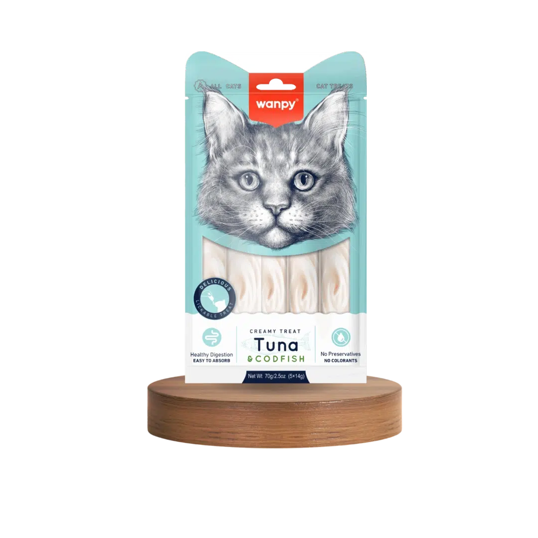 Wanpy Tuna & Cod Fish Cat Creamy Treat – is a delectable, lickable snack crafted from real tuna and cod fish. Its silky-smooth texture and savory aroma make it a perfect choice for rewarding, hand-feeding, or topping daily meals. Packed with essential proteins, vitamins, and taurine, this treat supports your cat’s overall well-being and promotes hydration. Free from artificial colors and preservatives, it ensures a safe, healthy indulgence your cat will love.