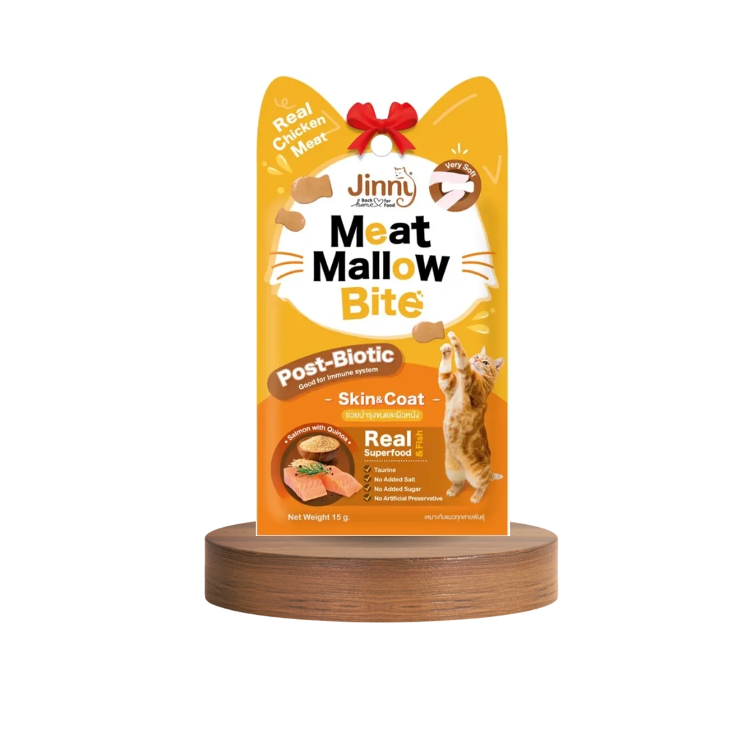 Jinny Cat Meat Mallow – Salmon treats are crafted with real chicken meat as the primary ingredient, delivering high-quality protein and irresistible flavor. Their soft and chewy texture ensures easy digestion, making them perfect for older cats or those with sensitive teeth. Enriched with salmon and quinoa, these treats provide essential fatty acids and nutrients to promote healthy skin and a shiny coat. Post-biotics support gut health and boost immunity, while the absence of added salt, sugar, or artificial preservatives makes them a wholesome, guilt-free choice for your cat’s snacking needs.