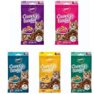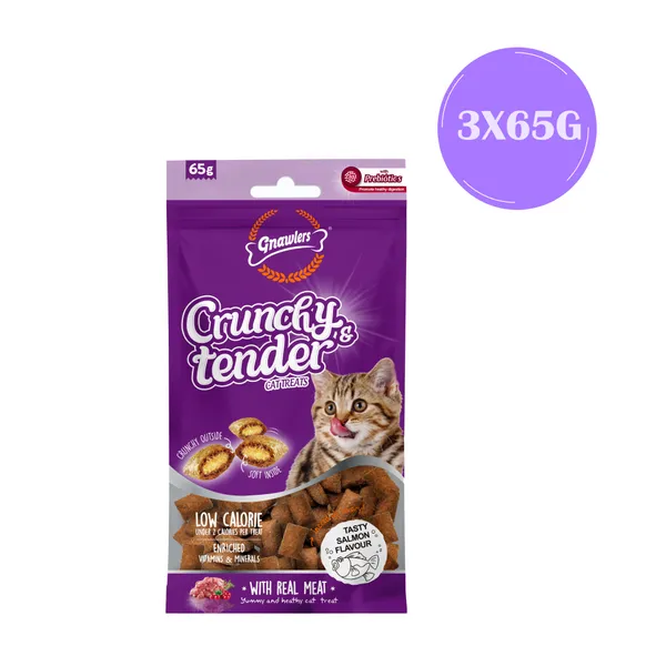 • – GNAWLERS Crunchy & Tender cat treats made with real salmon, irresistible crunchy on the outside and feature a delicious, soft center.