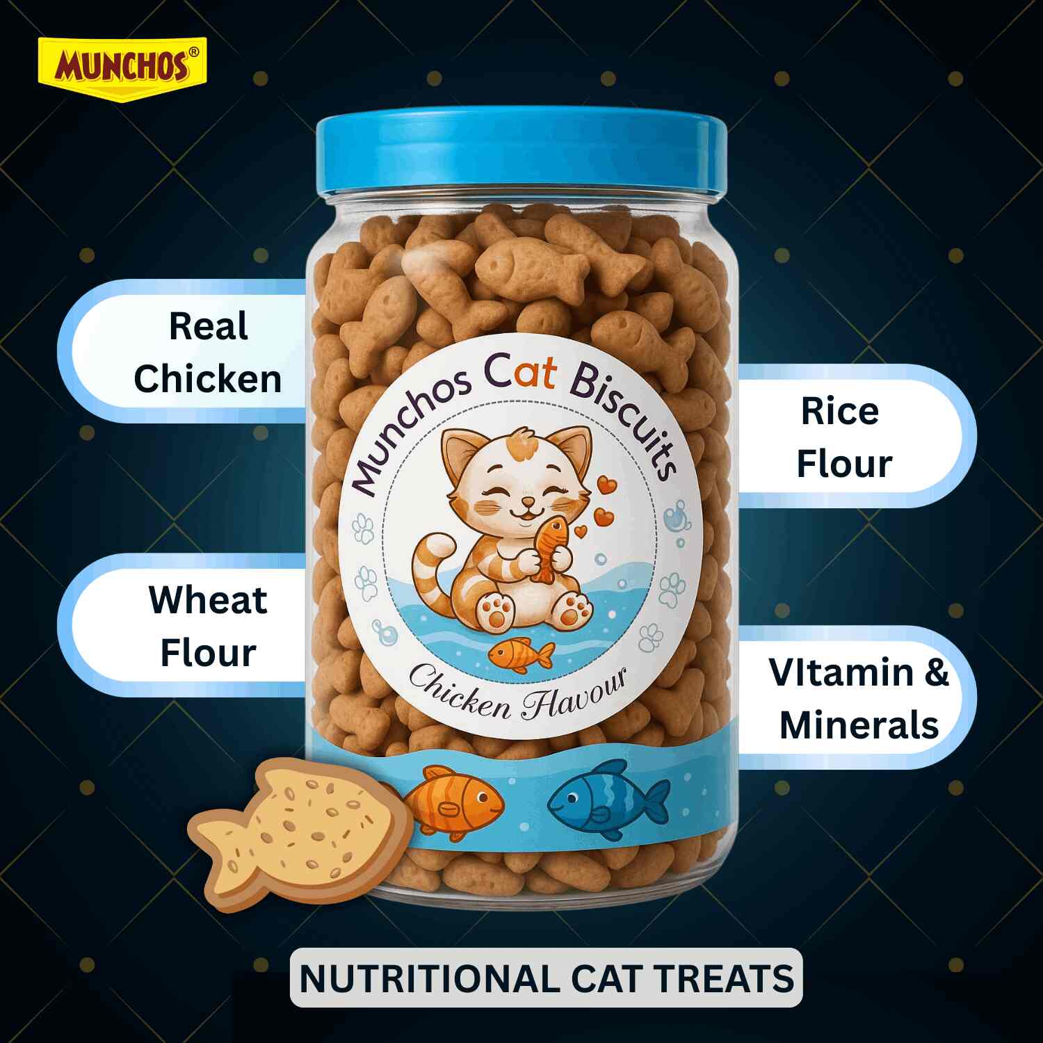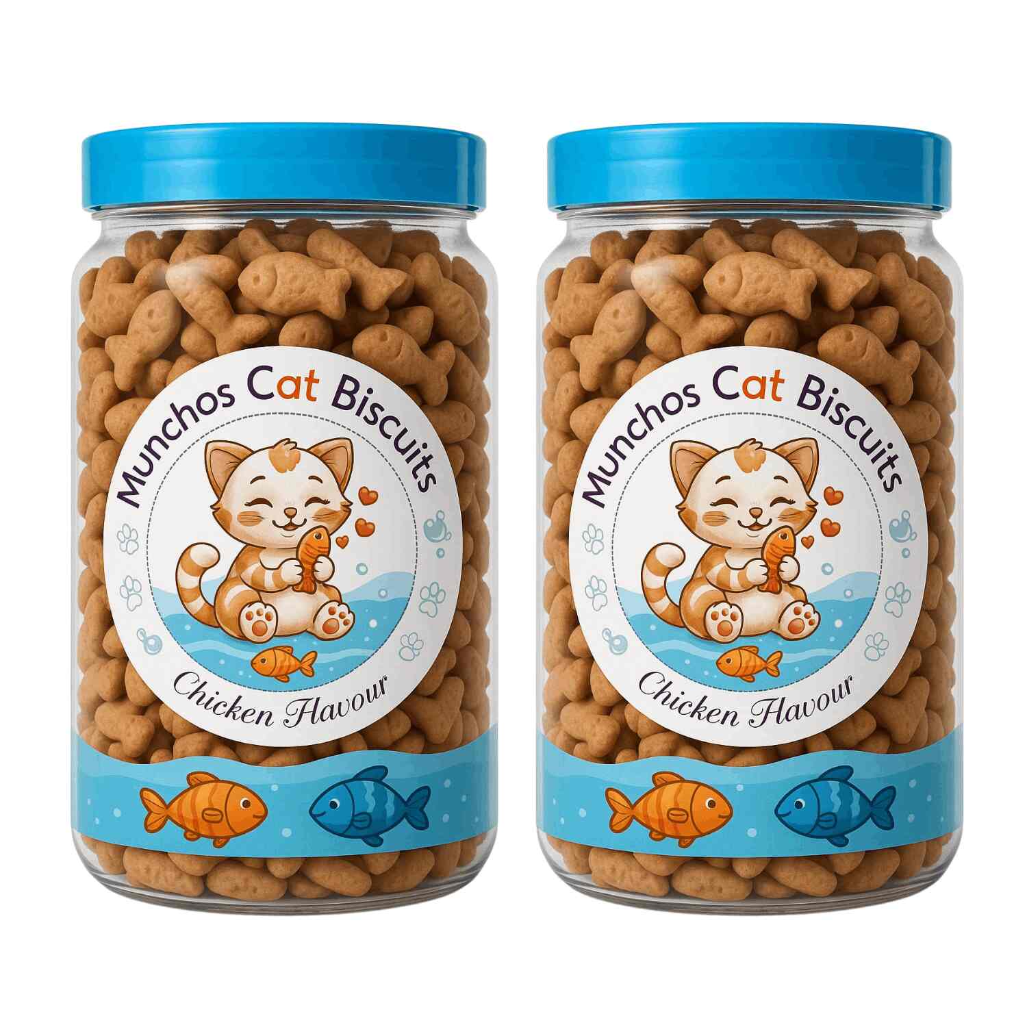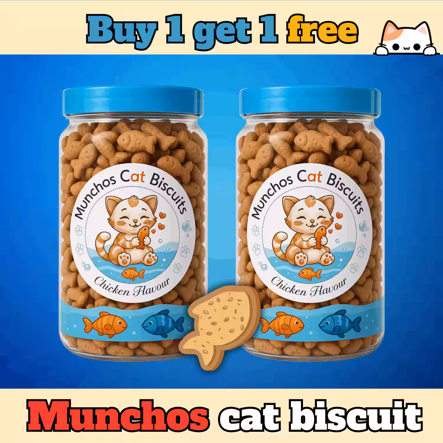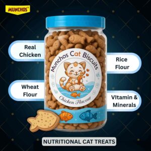 Treat your feline friend to the irresistible crunch of Munchos Cat Biscuits! These delightful shaped treats come in a convenient pack of two 250g jars, offering excellent value with a buy-one-get-one-free deal. Each biscuit is carefully crafted with a delectable chicken flavour that cats simply cannot resist. The crunchy texture helps promote dental health while satisfying your cat’s snacking desires. These treats are perfect for training, rewarding, or simply showing your cat some extra love. The resealable jars ensure maximum freshness and easy storage. Suitable for cats of all life stages, these biscuits make for a tasty and nutritious snack time option. Store in a cool, dry place to maintain optimal freshness. Made in India with quality ingredients, these treats are specially formulated to meet your cat’s nutritional needs while delivering a taste they’ll love. Please note: Always supervise your pet during treat time and ensure fresh water is available.