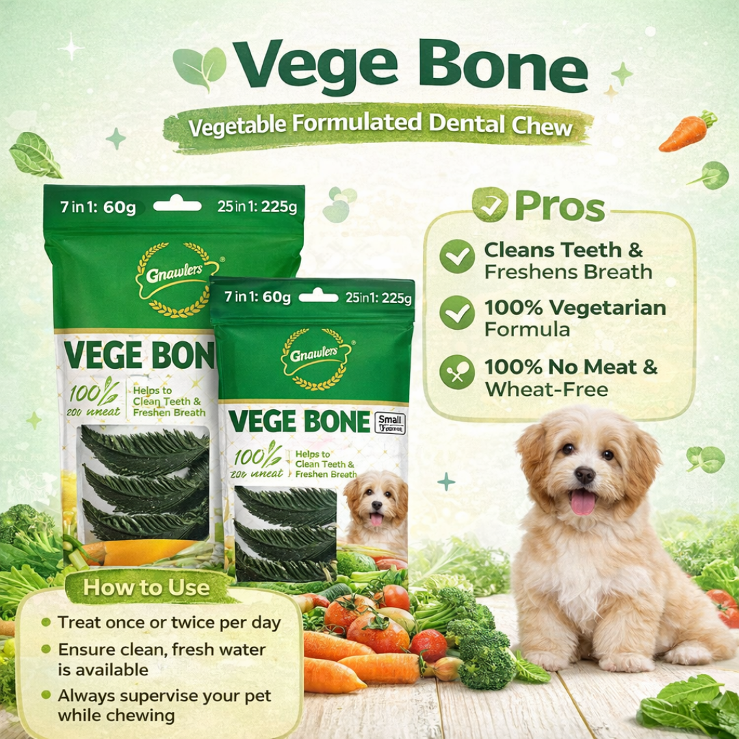 Vege Bone is a delicious, healthy treat designed to promote good oral hygiene and fresh breath for your pet. Made with 100% vegetable ingredients, these bones are perfect for dogs who need a meat-free alternative to traditional chews. The unique vegetable formulation is great for cleaning your dog’s teeth while providing an enjoyable chewing experience.