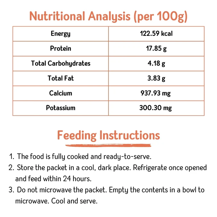 | Feeding instructions | The food is fully cooked and ready-to-serve. No need to cook. Simply thaw and serve | The food is fully cooked and ready-to-serve. No need to cook. Simply open the pack and serve |