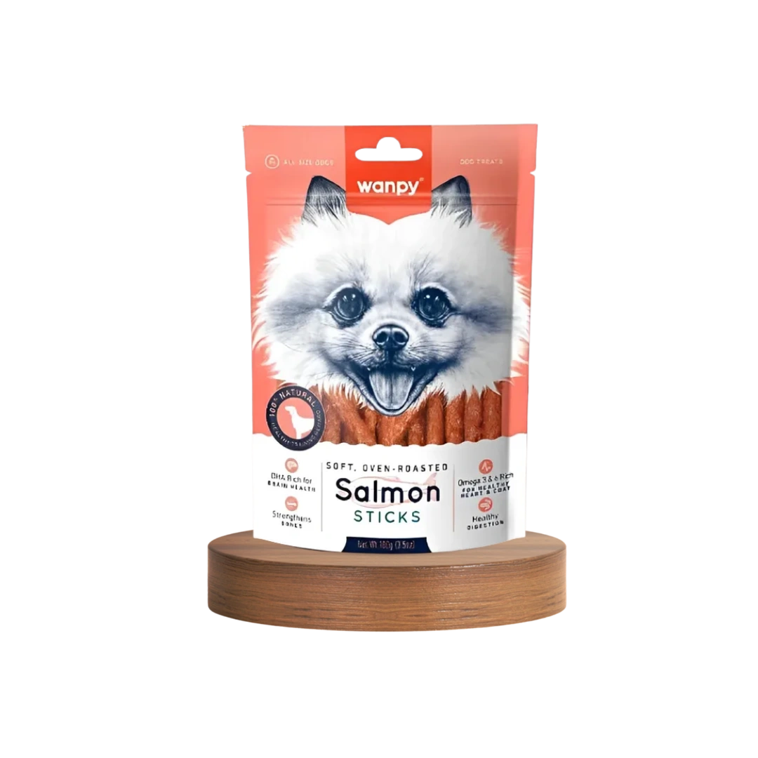 Wanpy Soft Oven Roasted Salmon Sticks Dog Treats are ideal treat or training reward, these salmon sticks are all natural, high in protein and low in fat. Features & Benefits All natural Resealable bag for freshness Perfect for a reward in between mealtimes (not to be substituted for meals).
