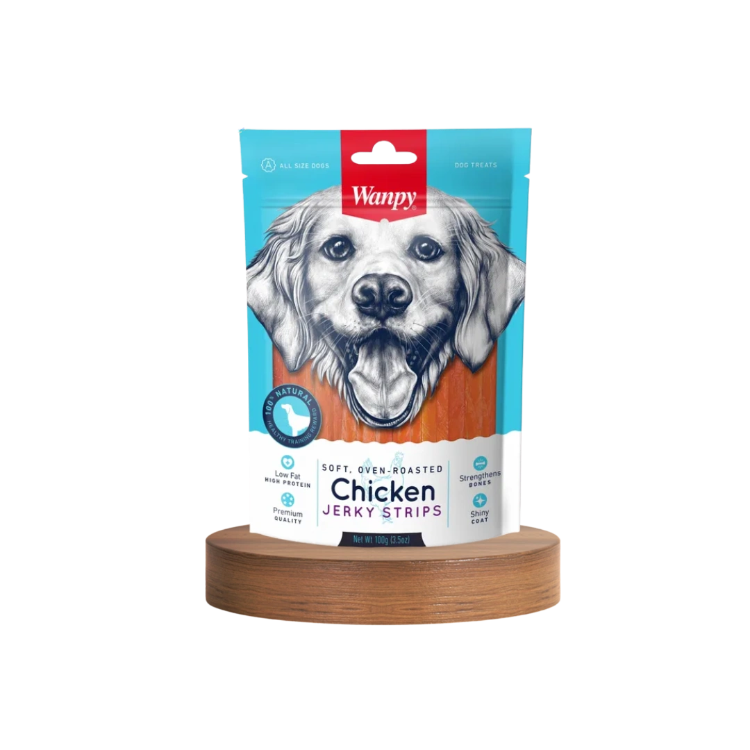 Your pup’s ears will prick up when they hear wanpy Soft Oven Roasted Chicken Jerky Strips Dog Treats are being opened! An ideal treat or training reward, these chicken roasted stripes are all-natural, high in protein, and low in fat. Features & Benefits All natural Resealable bag for freshness Perfect for a reward in between mealtimes (not to be substituted for meals).